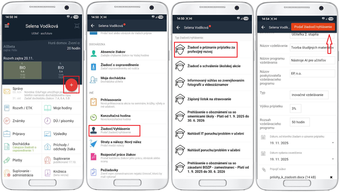 Ak to váš školský administrátor povolí, v EduPage môžete podať žiadosť o priznanie príplatku za profesijný rozvoj elektronicky.