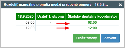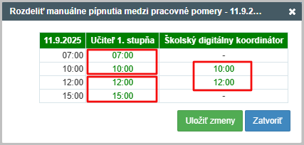 - Objaví sa tabuľka, kde si v jednotlivých stĺpcoch pomerov preklikáme požadované časy (klikmi do políčok s časmi). V našom príklade učiteľka pracovala od 7:00-10:00 a potom od 12:00-15:00 a ako šdk pracovala od 10:00-12:00.