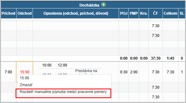 - Klikneme do políčka s príchodom alebo odchodom a vyberieme z ponuku funkciu "Rozdeliť manuálne pípnutia medzi pracovné pomery".