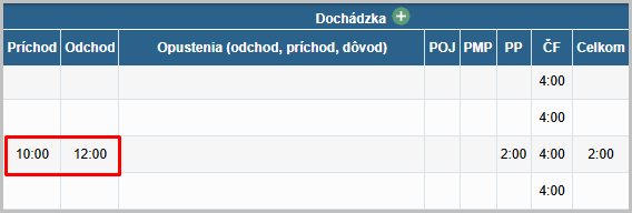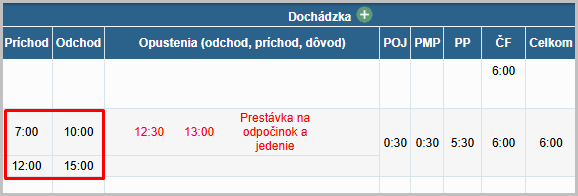 Po kliknutí do políčka s príchodom alebo odchodom a vybratím funkcie "Rozdeliť...." vyklikáme časy tak, že napr. šdk pracuje a učiteľka má voľno: