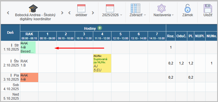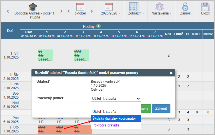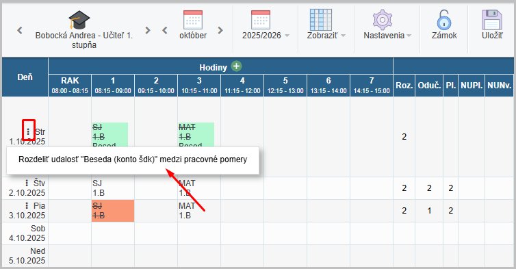 1. Klikom na tri bodky v daný deň vyberieme z ponuky "Rozdeliť suplovanie..."