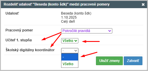 Funkcia "Pokročilé pravidlá" po kliknutí rozbalí ponuku, kde si môžeme vybrať, či daná udalosť (prípadne suplovanie, neprítomnosť) patrí pod obe kontá "Všetko" alebo pri pomer zvolíme "-" ako znak, že k tomuto pomeru dané nastavenie nepatrí.