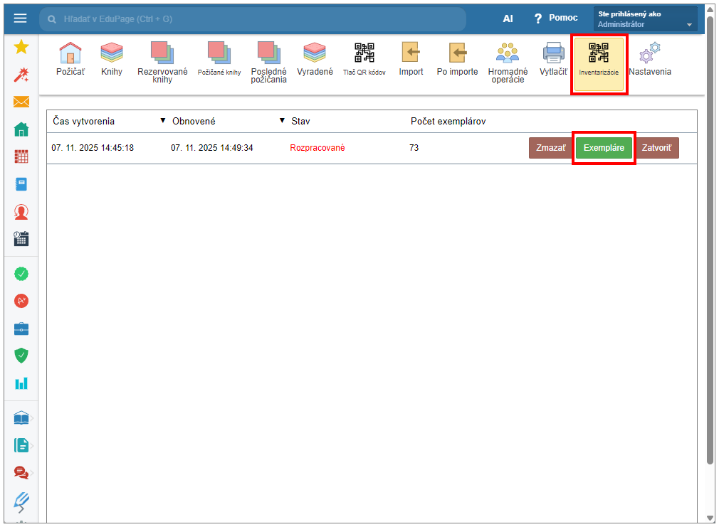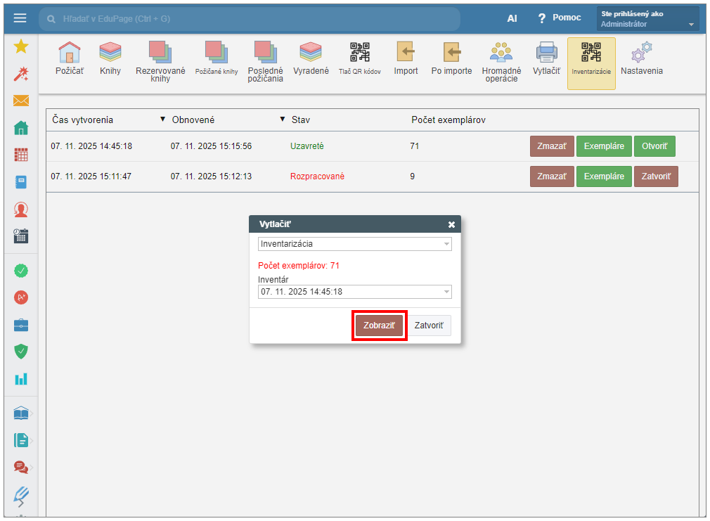 Zobrazí sa zoznam doteraz vykonaných inventarizácií s informáciami o dátume ich vyhotovenia, obnovenia, o ich stave a o počte inventarizovaných exemplárov. Inventarizovaný zoznam je identifikovaný podľa dátumu vytvorenia. Inventarizácie viete Zatvoriť, Otvoriť, prehliadať, Vytlačiť, Zmazať.
