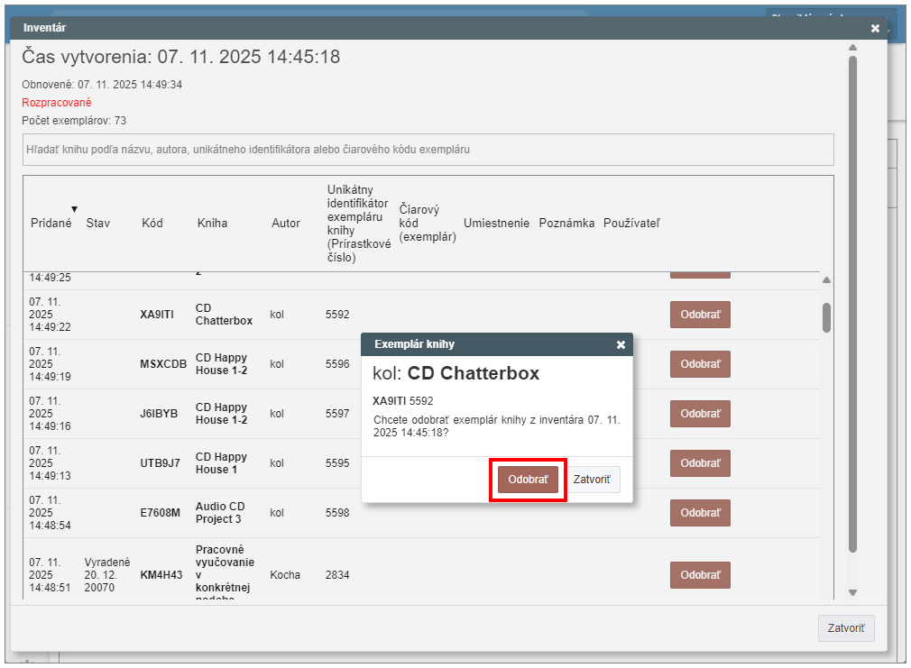 V prípade, že je kniha po zápise do inventarizačného zoznamu vyradená, alebo vymazaná, zobrazí sa táto informácia, vrátane dátumu, pri inventarizovanej knihe. Informácia sa zobrazí aj pri knihe v zatvorenom zozname. Exemplár viete zo zoznamu odobrať stlačením “Odobrať”.
