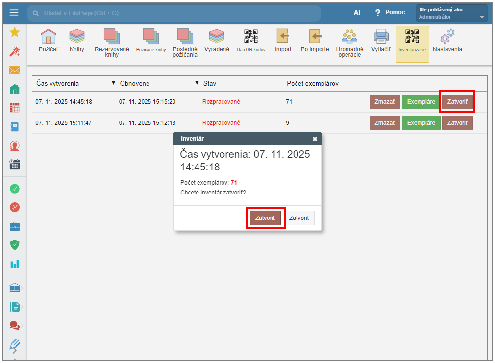 Po ukončení inventarizácie môžete zoznam uzavrieť voľbou “Zatvoriť”. Do zatvoreného zoznamu sa nebudú dať zapisovať nové položky.