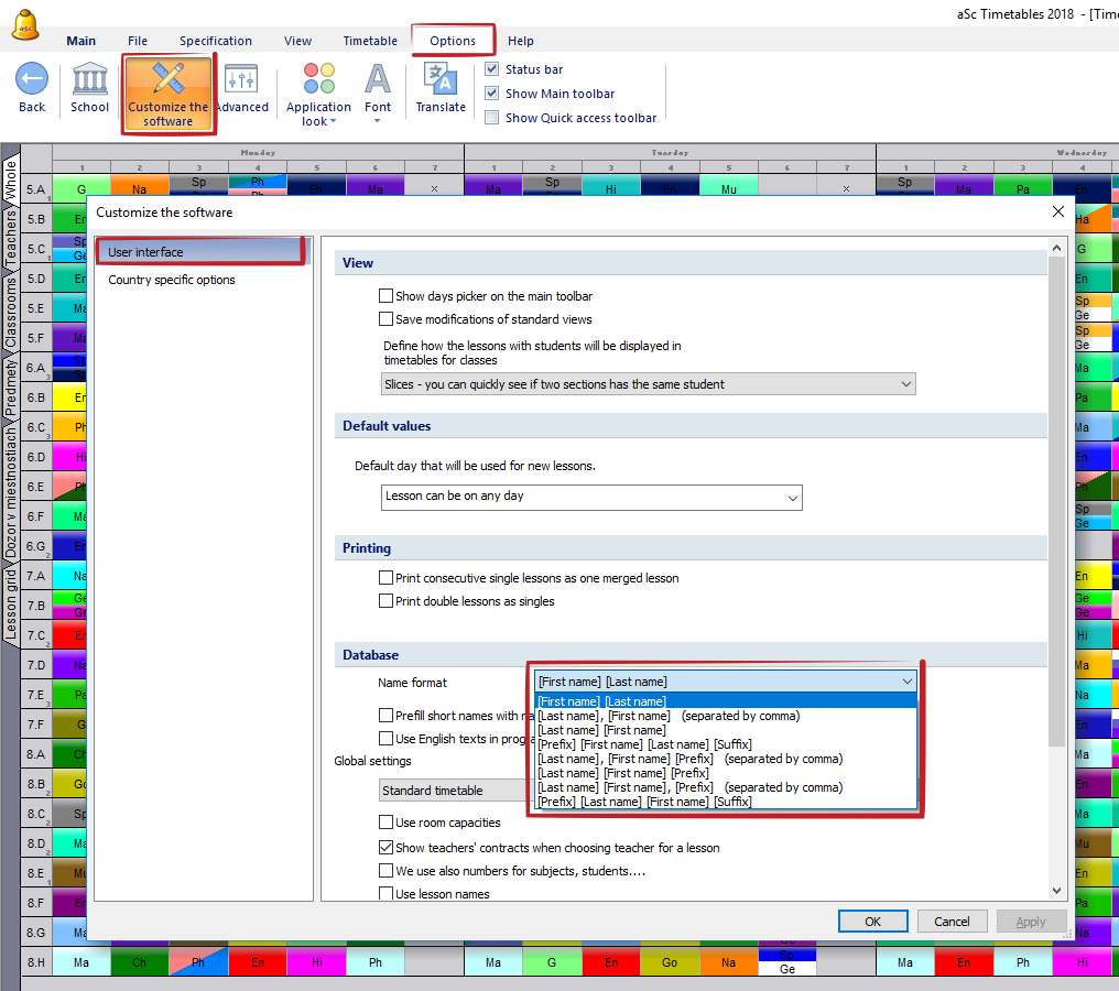 To fix this, you have to configure format of the names in aSc Timetables. You can do this in menu - Options - Customize the software - User interface - Database - Name format.