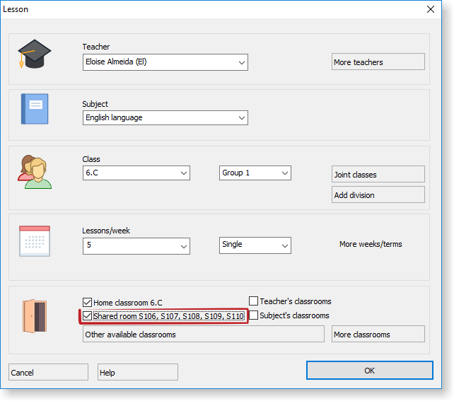 And of course, in some special cases, it is always better to mark particular classes separately. E.g for "Physical education" you will not use home classrooms or shared rooms but rather specify the exact room(s) as "Gym" or "Swimming pool":
