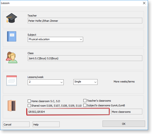 Important: the software will use only ONE of the specified rooms. So if you say, that the lesson can be in the shared classroom, or in GR502, or in GR504, than the software will use only one of these three options.