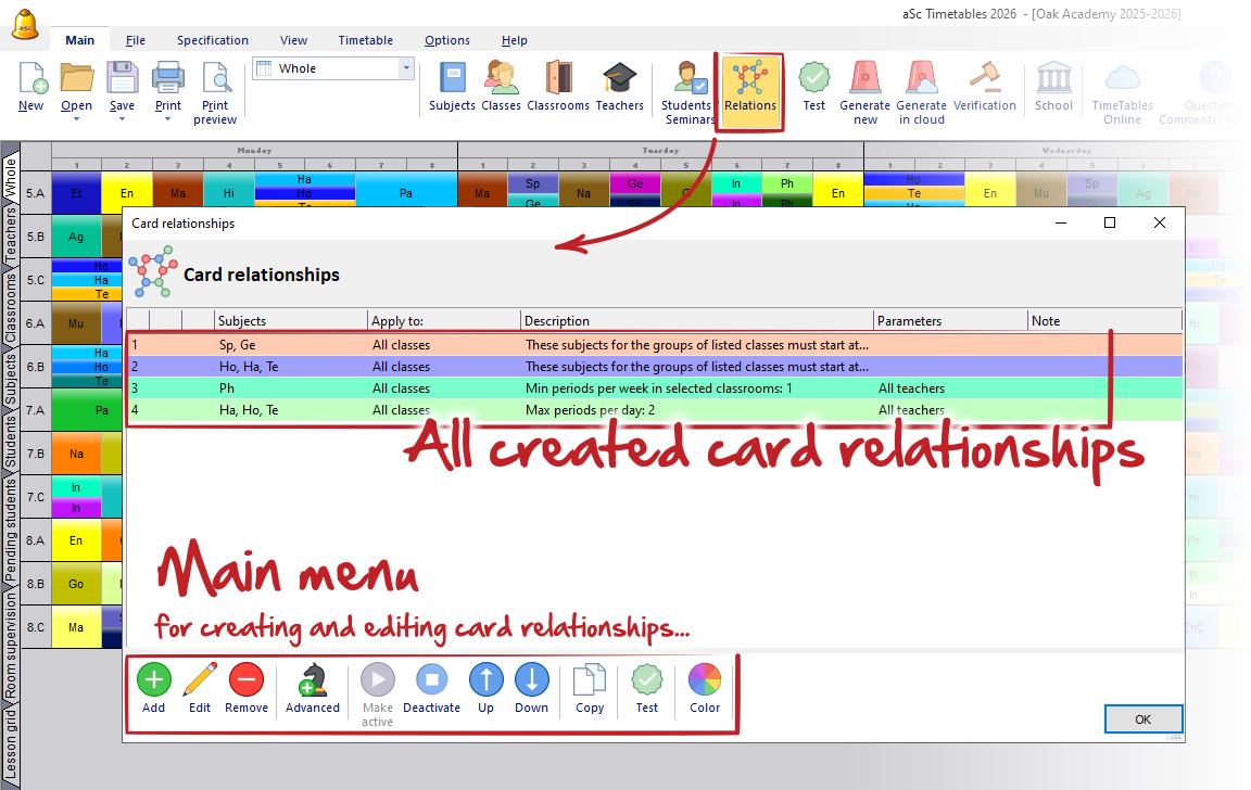 In aSc Timetables you can add many constraints which are linked to each individual object - teacher, class, subject or classroom. For more precise outcomes in your timetable you can create card relationships which can be applied to more selected objects at once.