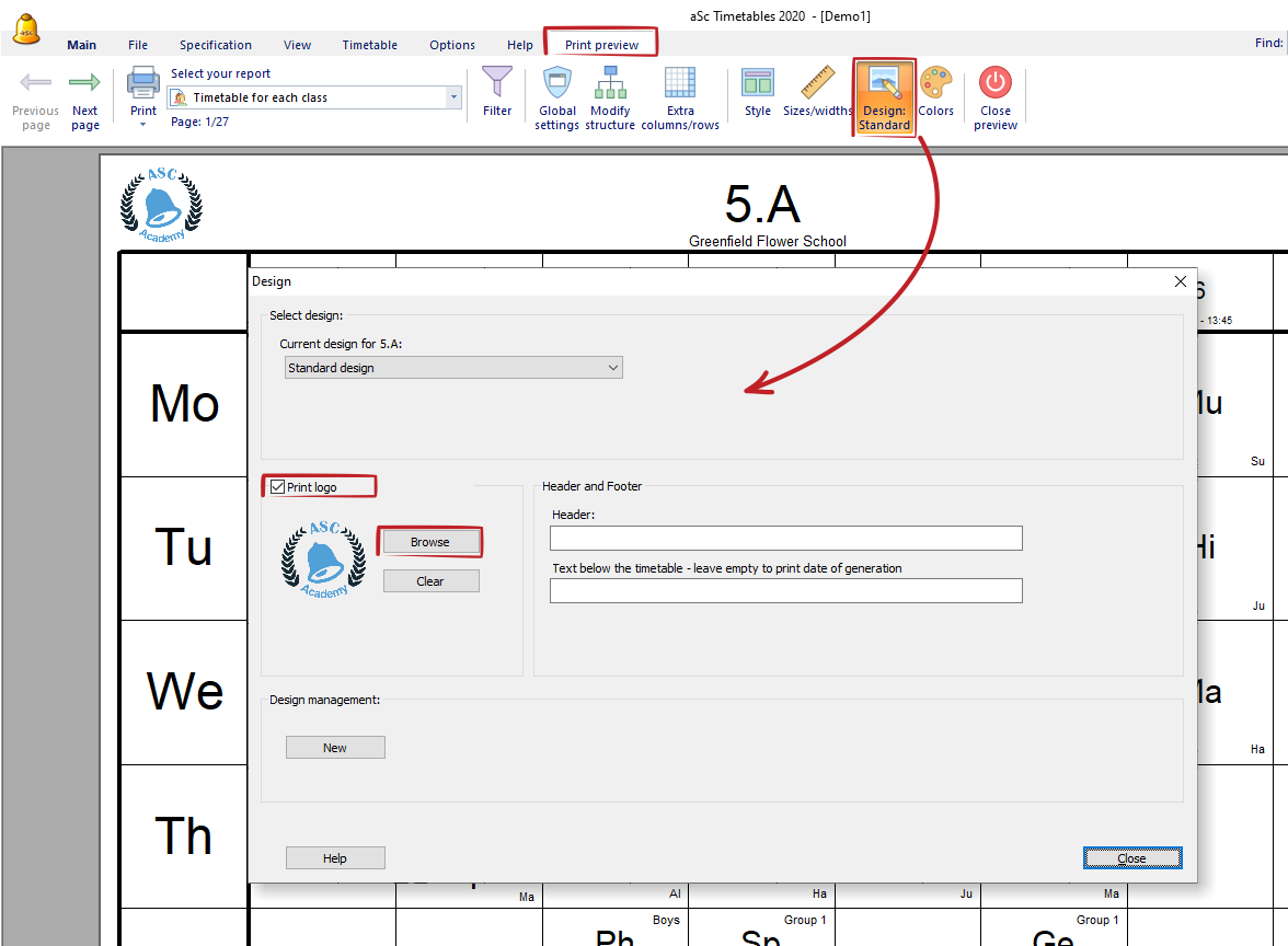 If you wish to print also school's logo on every printed timetable, you can add it in print preview - Design - Print logo - Browse and select the path to the image file with your school's logo.
