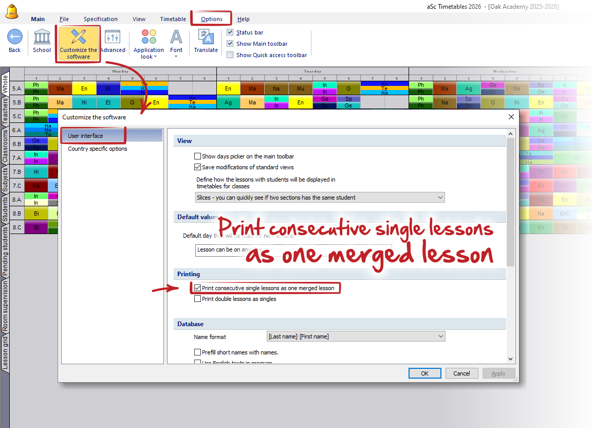 - this applies to printouts only. The timetable displayed in the software will show two single lessons.