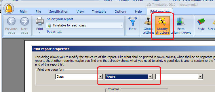 If you want to print each week on separate paper, go to "Modify structure" and add "Weeks" into headers: