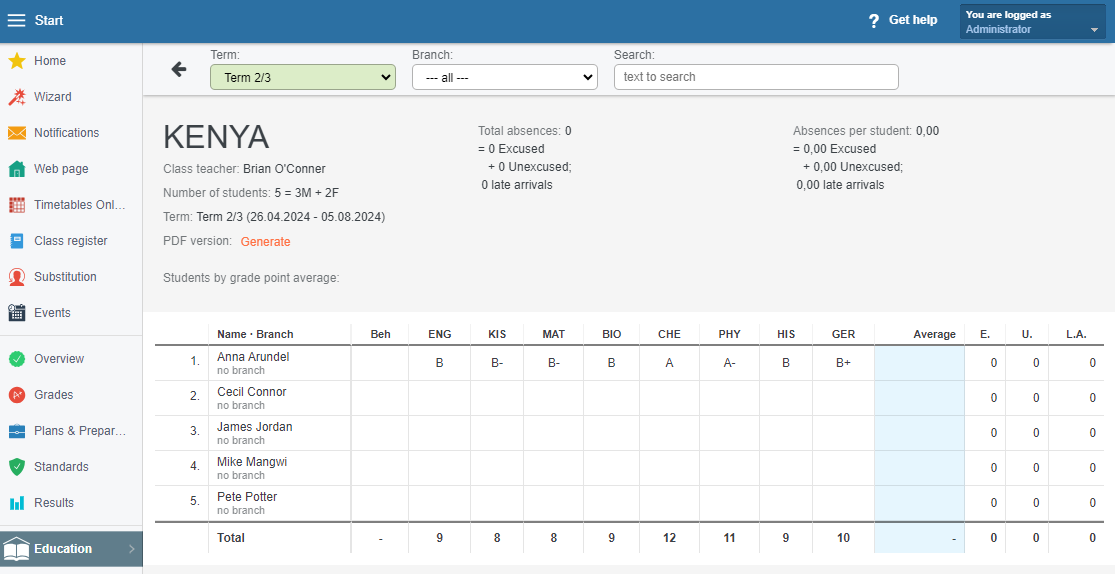 The system will display statistics of class averages by individual subjects.