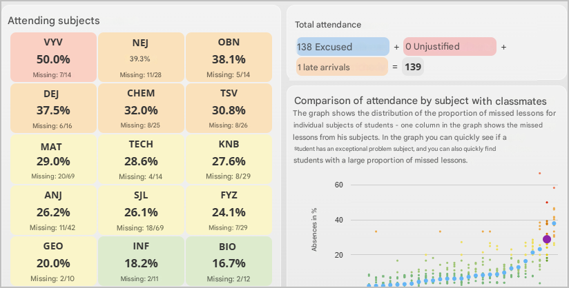 Information about a student’s attendance is also important — specifically, the percentage of lessons in a given subject that the student has missed during the current grading period.