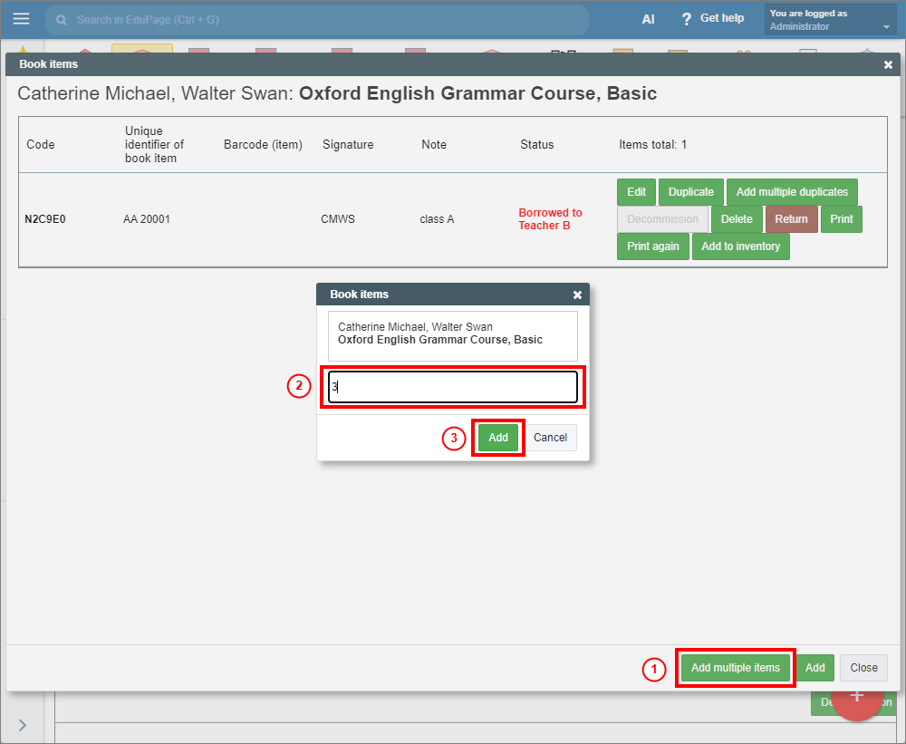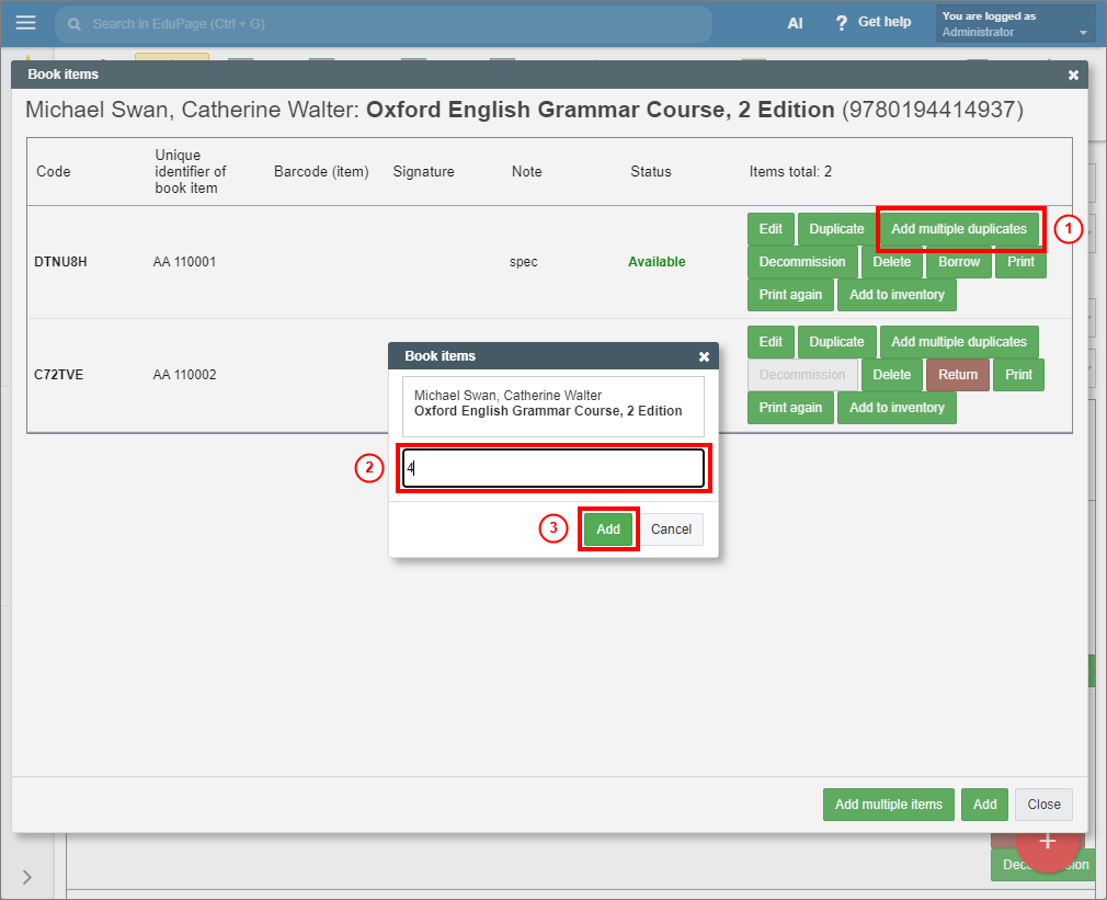 In the Textbook Storage, you can add multiple duplicates (copies with entered specifications) at a time by choosing “Add multiple duplicates” in the row of the desired item.