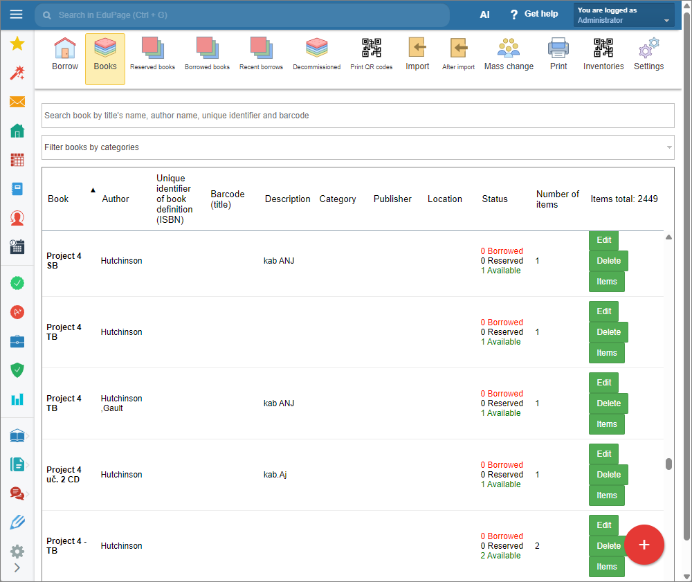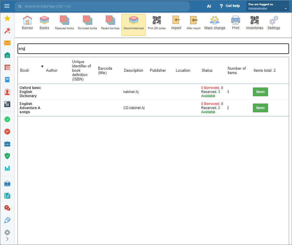 In the “Book” tab, you can view, add, edit, lend, decommission and delete titles and their items. To edit items, select the “Items” tab of the desired title.
