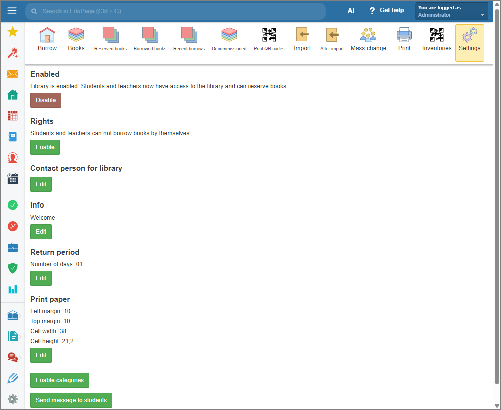 In the “Settings” tab, you can enable or disable access to the Library module, allow teachers and students borrow books by themselves, set the library contact person, define library information visible to users, set the loan period, set the print size of QR-code labels, enable a broader list of categories and create and send a message to students.