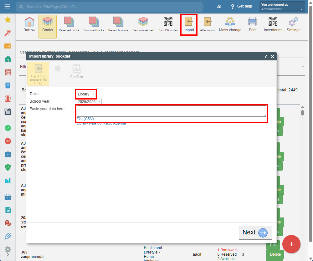 To perform the desired operation, as a library administrator, choose the appropriate tab from the Library’s top main menu.