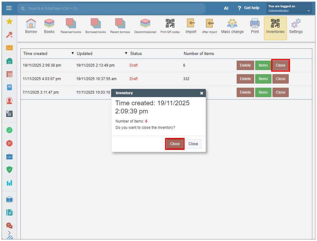 After finishing the process, you may close the inventory record by clicking “Close”. Once closed, adding new items to the record will be blocked.