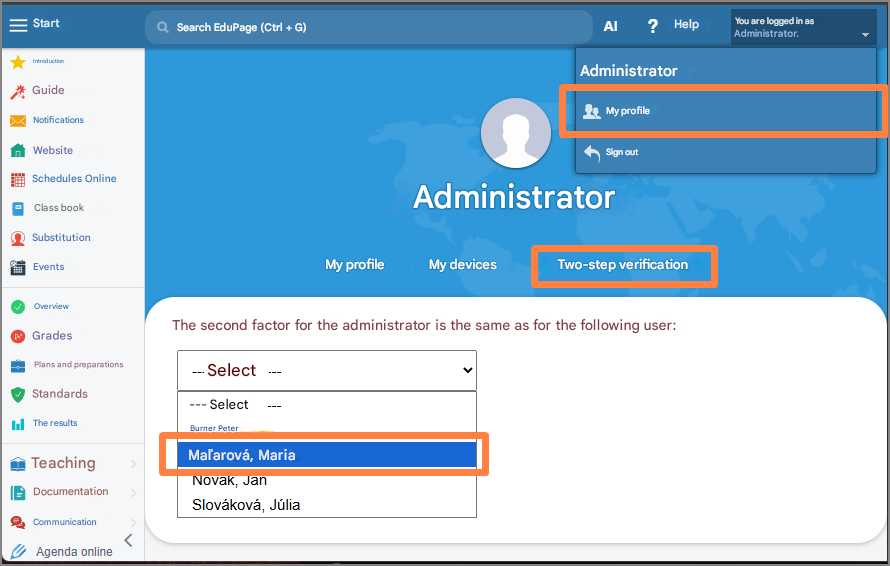 An administrator in EduPage has the option to enable two-step verification directly on their administrator profile.
