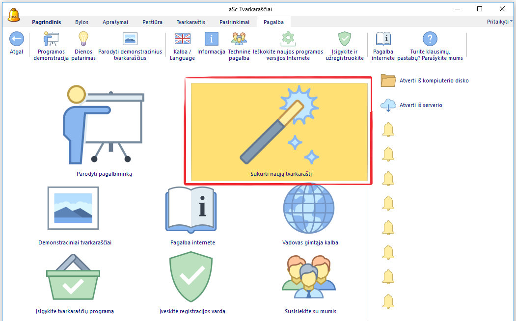 2. Pasirinkus Bylos, Nauja sukurti naują pamokų tvarkaraštį: programa sukurs naują tvarkaraščio langą, kuriame Jūs galėsite įvesti visus duomenis: klases, disciplinas, mokytojus, pamokas, kabinetus ir kt. reikiamus duomenis.