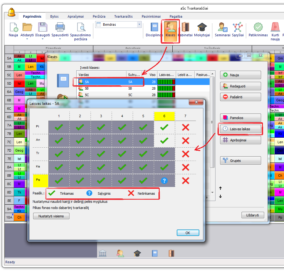 Paspaudę mygtuką "Laisvas laikas...", galite nurodyti, kada kiekviena klasė gali turėti pamokas. Pavyzdžiui, jei ketvirtadienį po pietų 8-osios klasės išvyksta į praktiką, galima užduoti, kad programa šiuo laiku joms į tvarkaraštį nedėtų pamokų, pažymint aštuntoms klasėms ketvirtadienio 5-8 pamokas raudonu kryžiuku.