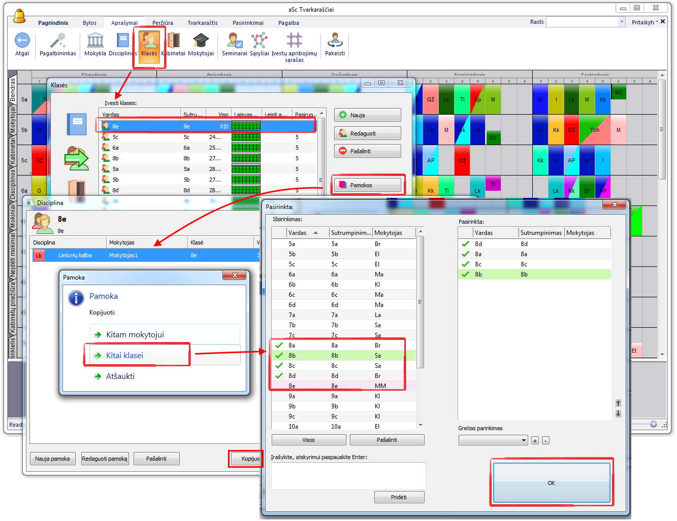 3. Atsidariusiame lange pažymėkite tas klases, kurioms išrinktas pamokas norite nukopijuoti.
