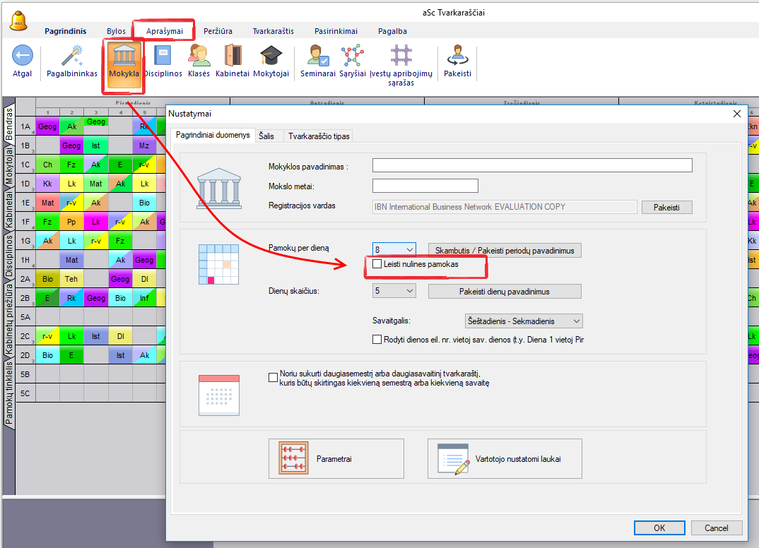 Nulines pamokas (tai viena pamoka tvarkaraštyje, einanti prieš pirmąją) galite panaikinti arba užduoti, kad būtų naudojamos, lange "Pagrindinis, Mokykla" arba "Aprašymai, Mokykla":