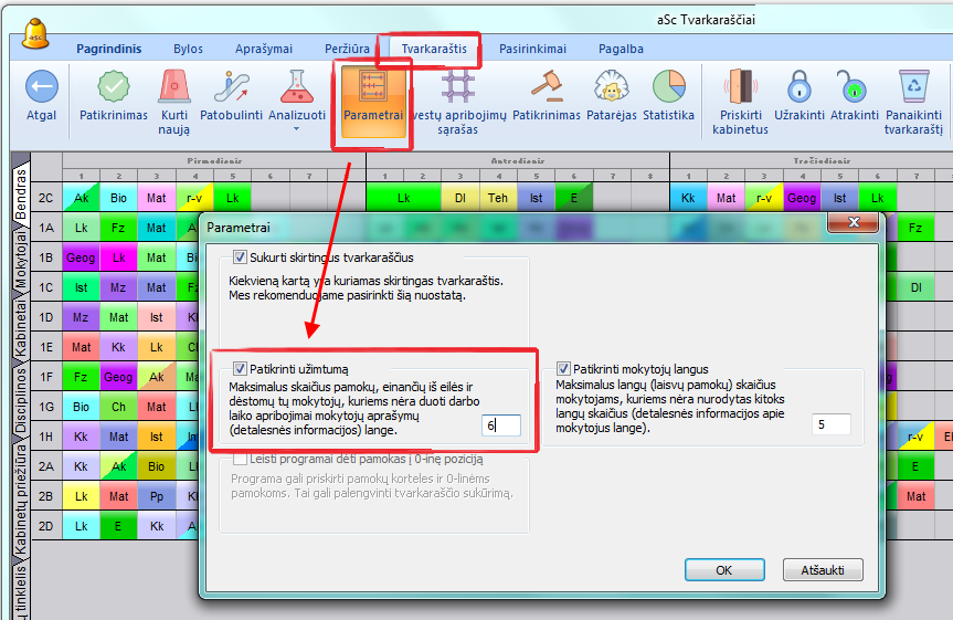 Maksimalų nuosekliai einančių pamokų skaičių mokytojams (jis nurodo, kiek pamokų mokytojas gali vesti be pertraukos) galima įrašyti "Tvarkaraščių, Parametrų" lange: