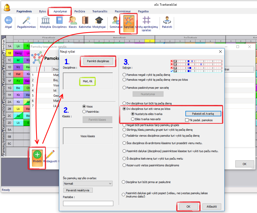 Galite sukurti pamokų sąryšį, kuris nurodo, kad dvi disciplinos (dalykai) privalo eiti vienas po kito (griežtai nustatyta arba bet kokia tvarka):