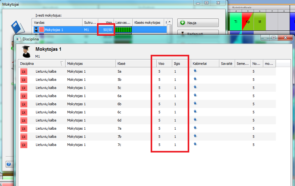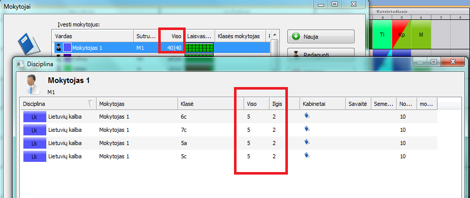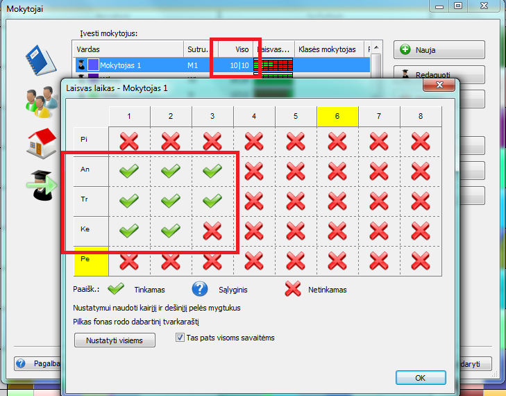 Nepamirškite ir laiko lentelės - gali būti, kad mokytojas turi pažymėtų leistinų pozicijų mažiau, nei jam paskirta pamokų. Tas pats galioja ir kabinetams.