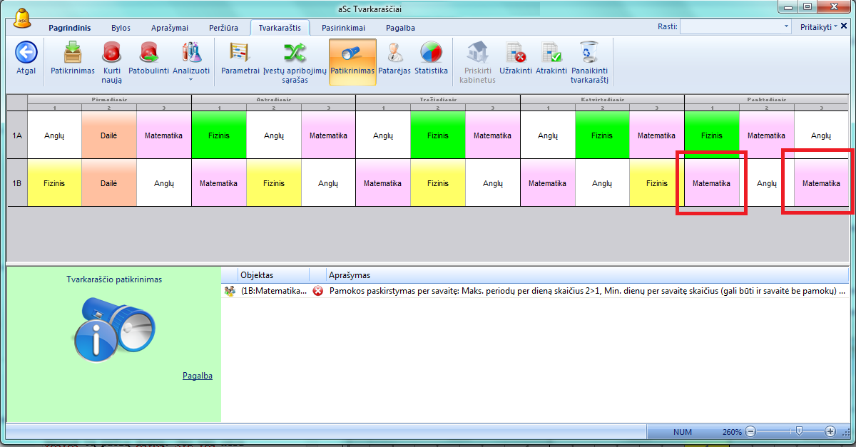 Kaip jau minėta anksčiau, pagal nutylėjimą programa laiko, kad jei yra 5 pamokos per savaitę, tada jūs norite, kad viena pamoka būtų kiekvieną dieną.