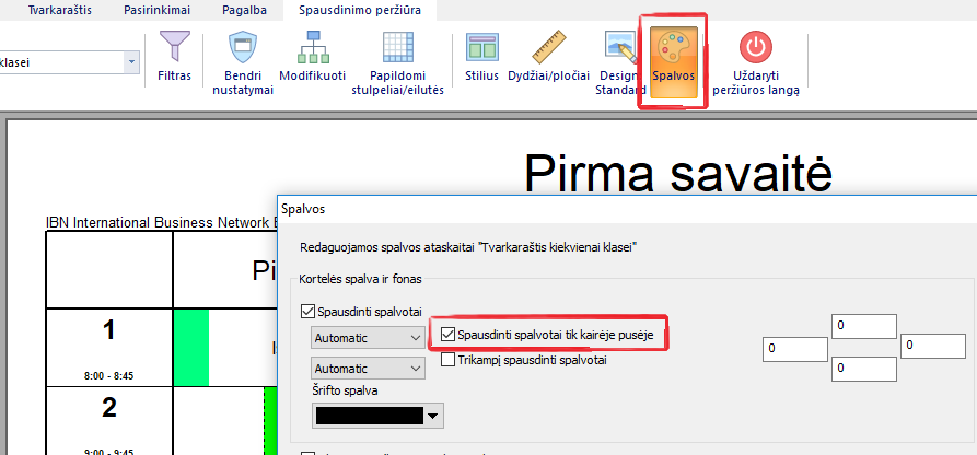 Jei nenorite spausdinti spalvotai viso tvarkaraščio, galite atspausdinti tik mokytojo spalvą kairėje kiekvienos pamokos kortelės pusėje: