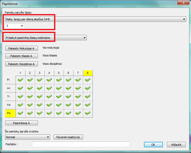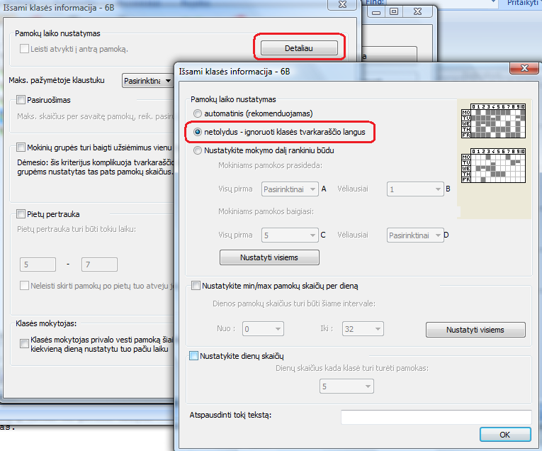 Nepasirinkus "Netolydus - ignoruoti klasės tvarkaraščio langus" programa kurs tokius tvarkaraščius, kuriuose klasėms langų nebus.