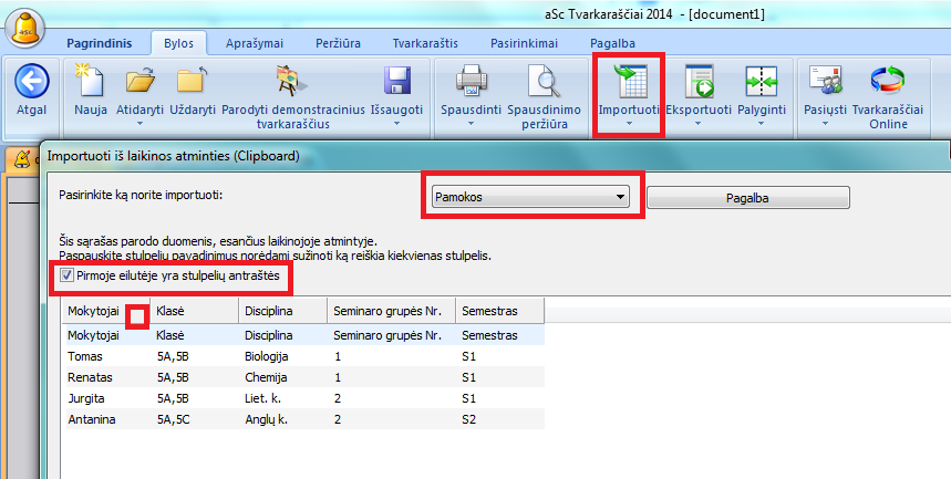 - Jei jūsų tvarkaraštyje jau yra įvesti mokytojai, disciplinos, klasės ir t.t., importavimo metu programa bandys juos suderinti. pvz. pamoką paskirti jau įvestam mokytojui. Jei atitinkamas objektas bus nerastas, importavimo metu jis bus sukurtas.
