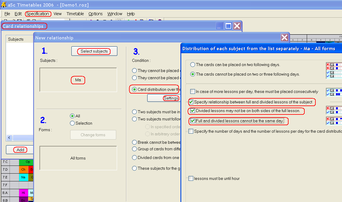 في بعض المدارس, بعض الدروس تدرس بطريقة وهي أن أغلب الدروس للمادة يدرسها الطلاب معاً كا فصل كامل , ولكن على سبيل المثال يوجد درس واحد ينقسم لمجموعتين. في هذه الحالة من الضروري وضع بعض القيود إذاً الجدول الزمني سيقوم بترتيب