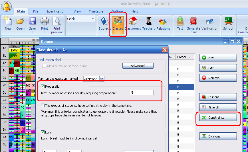 לאחר מכן תוכל לציין את המספר המרבי של מקצועות הלימוד הנ"ל, המתאפשרים ללימוד ביום אחד. ניתן לציין זאת בנפרד עבור כל כיתה: