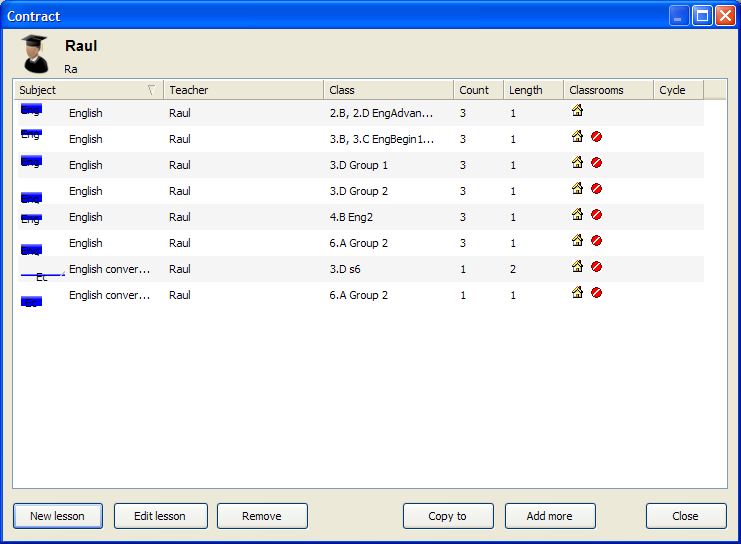לאחר שלוחצים על שיעורים ... או לאחר שתזין מורה חדש באמצעות האשף, תופיע תיבת השיח הבאה :