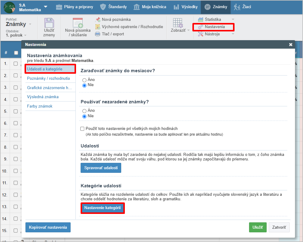 V nastaveniach svojej žiackej knižky vyhľadajte Udalosti a kategórie a zvoľte nastavenie kategórií.