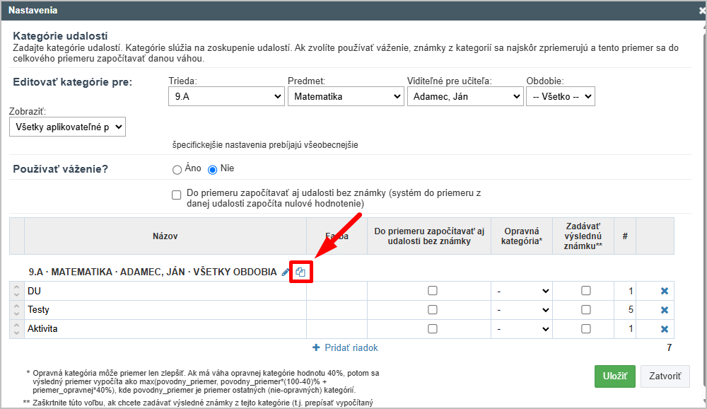Vyberte hodinu, v ktorej máte kategórie nastavené a kliknite na ikonu kopírovania.