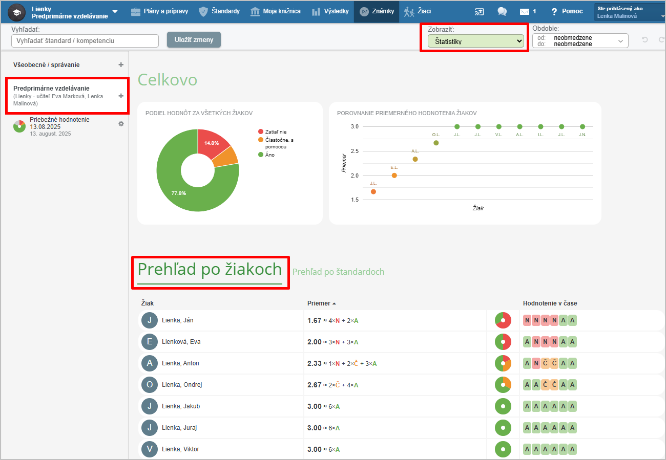 Kliknite na názov predmetu a zvoľte zobrazenie štatistík.