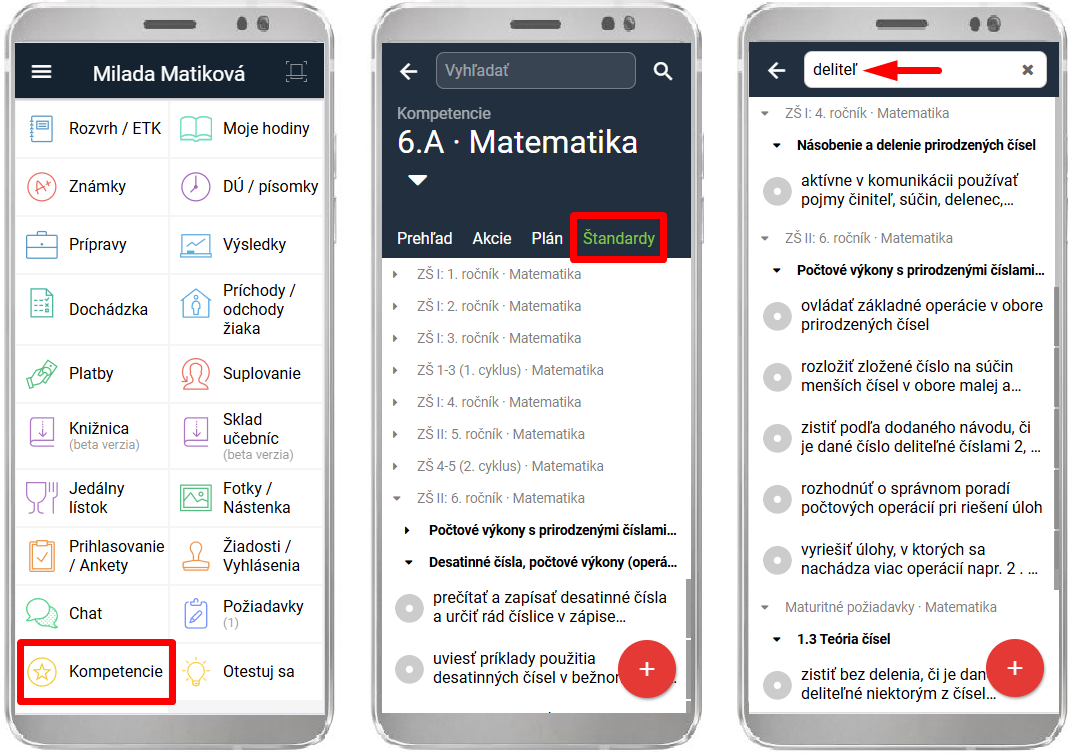 Vyberte Kompetencie. Zvoľte záložku štandardy. Vo vyhľadávači zadajte kľúčové slovo. Kliknite na štandard, ktorý chcete hodnotiť.