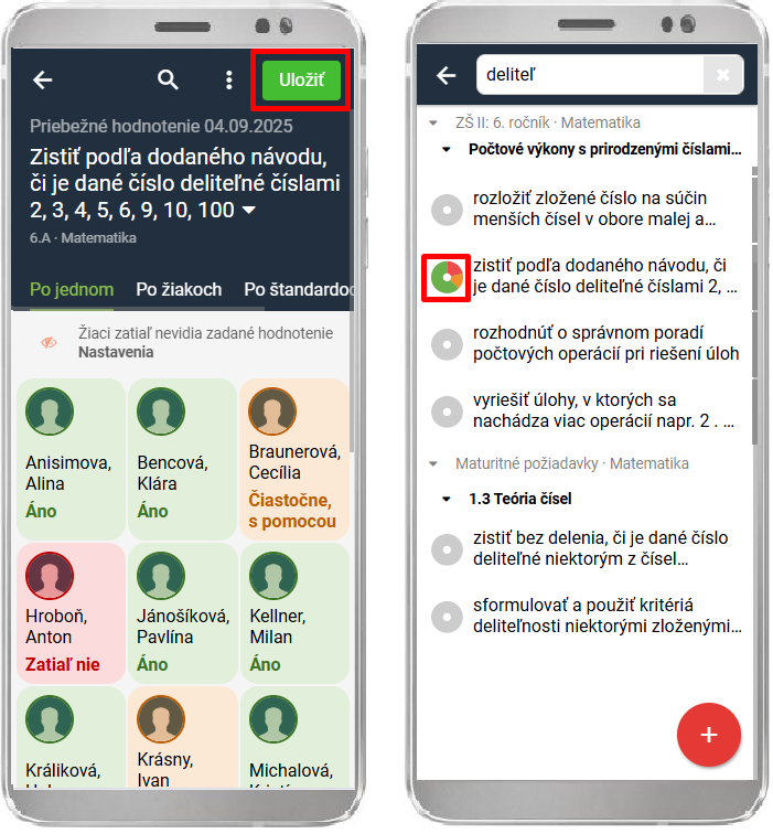 Hodnotenie žiakom nastavíte jednoducho kliknutím na žiaka raz/dvakrát/trikrát. Zadané hodnotenie uložte. Štandardy, ktoré sú ohodnotené, sú farebne zvýraznené.