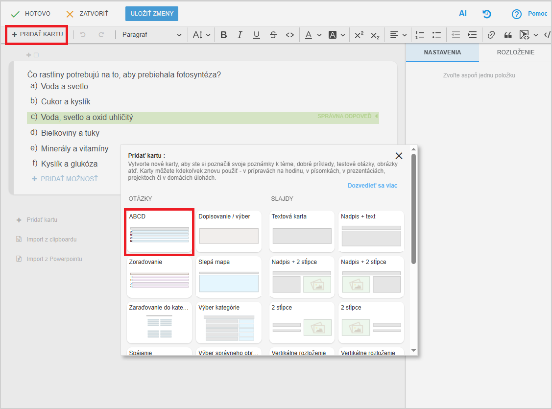 Kliknite na Pridať kartu. Vyberte otázku typu ABCD.