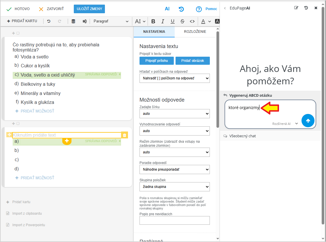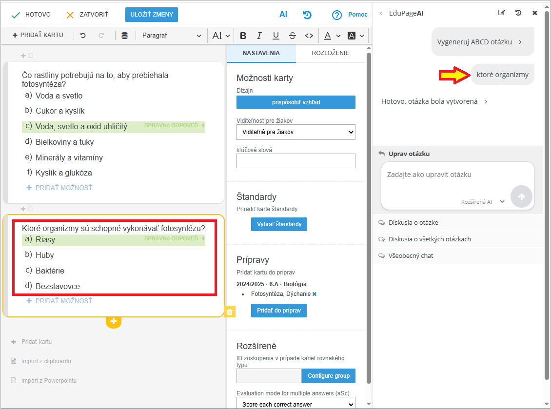 EduPage AI vie, že téma je fotosyntéza a vytvorí otázku v zmysle "v ktorých organizmoch prebieha fotosyntéza":