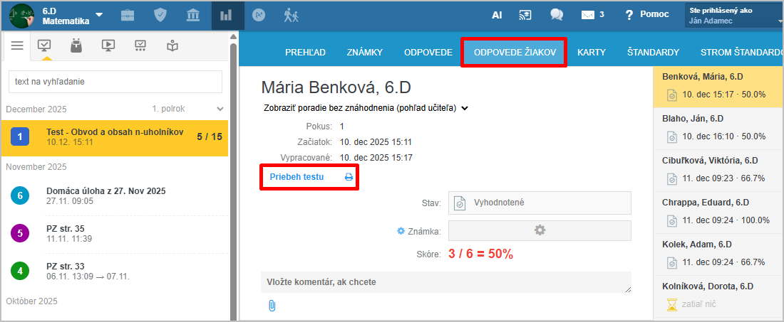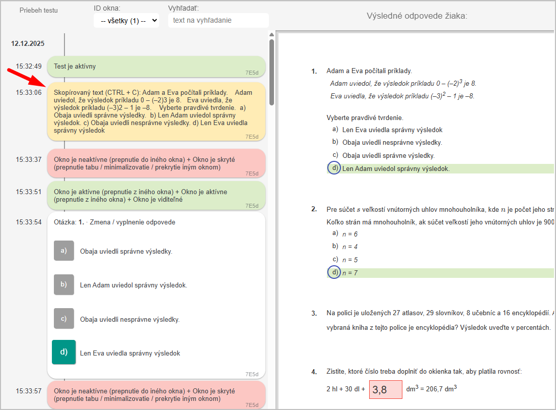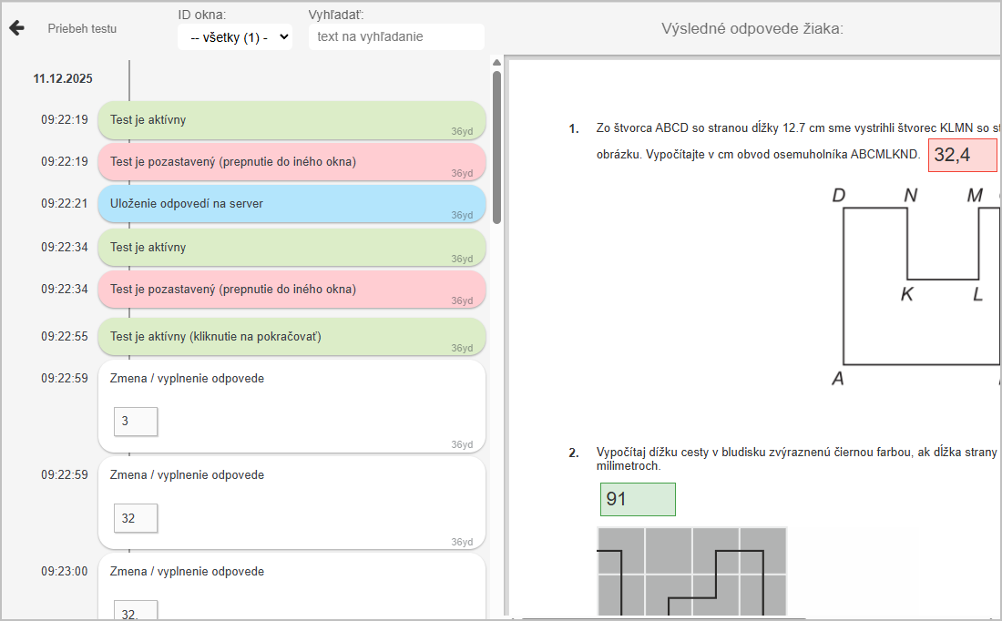 Kliknutím na konkrétneho žiaka sa zobrazí na pravej strane obrazovky test žiaka a na ľavej strane obrazovky sa zobrazí sled aktivít žiaka s časovými údajmi.