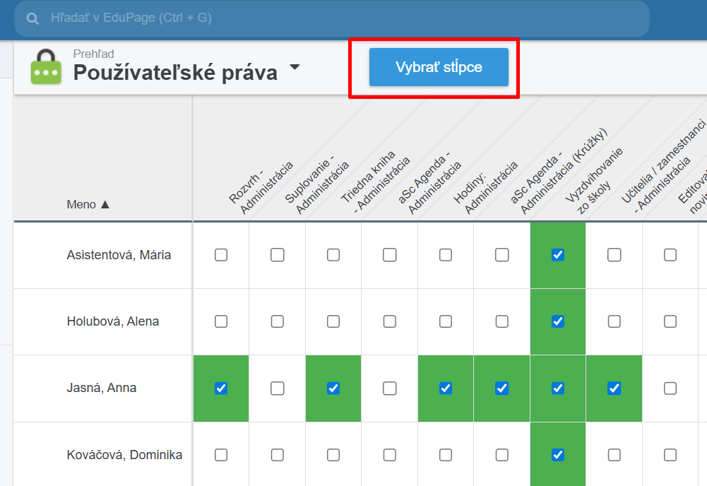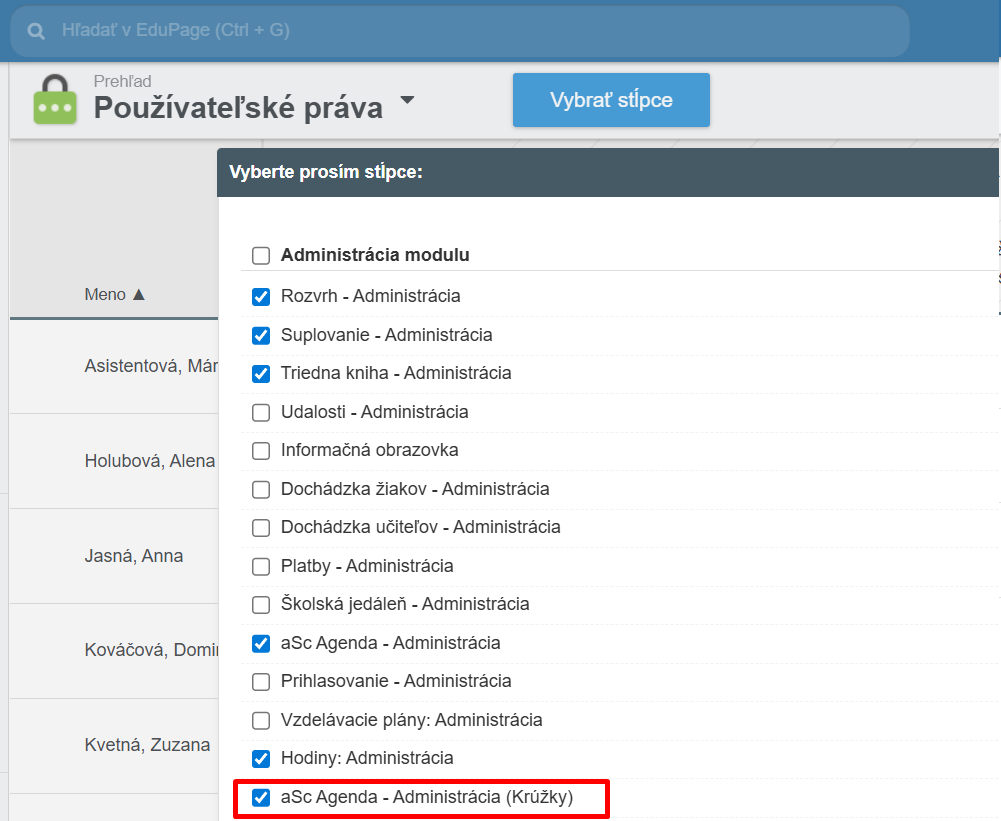 Ak sa stĺpec s požadovaným modulom nenachádza v zozname, môžete ho pridať stlačením tlačidla Vybrať stĺpce. Zaškrtnite moduly, ktoré chcete, aby sa vám v prehľade zobrazovali.