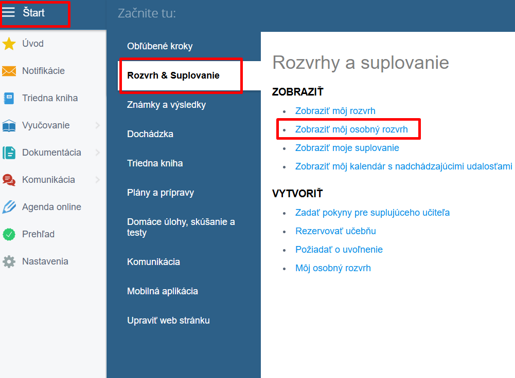 Učiteľ vie vytvárať vo svojom učiteľskom konte osobné rozvrhy učiteľov cez Môj osobný rozvrh . Tam vidí všetky osobné rozvrhy a vie ich upravovať.