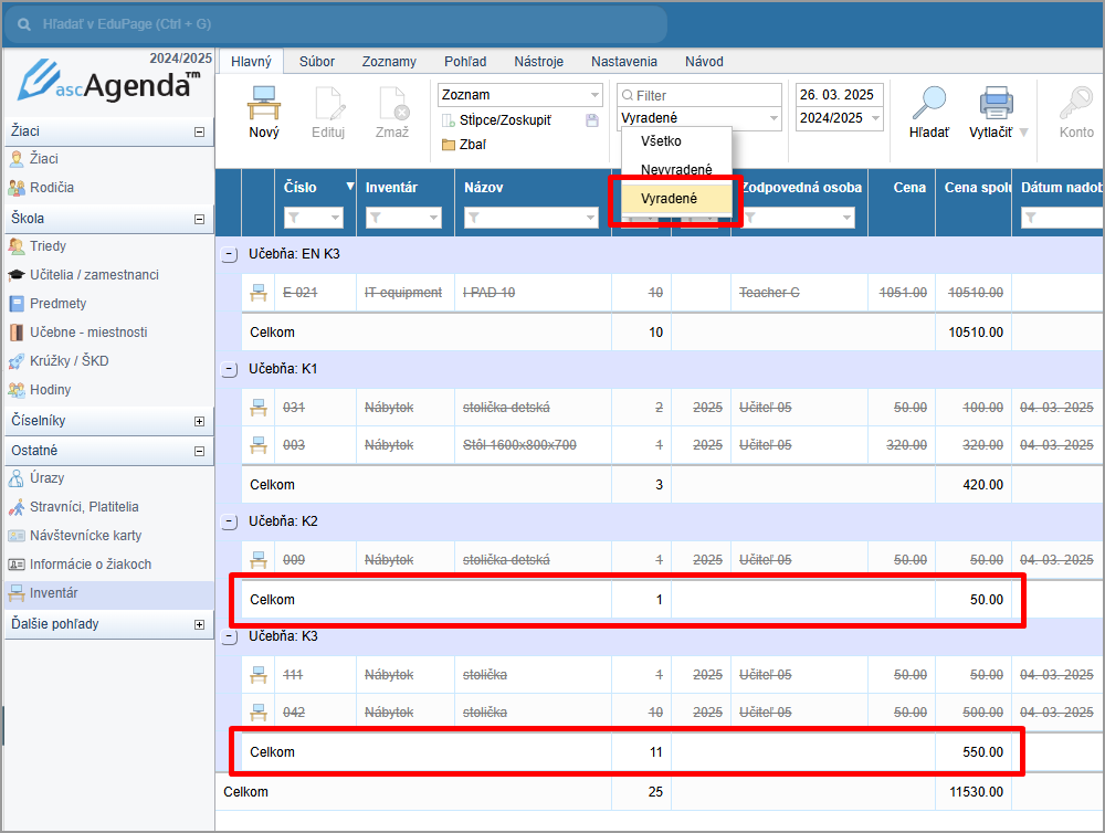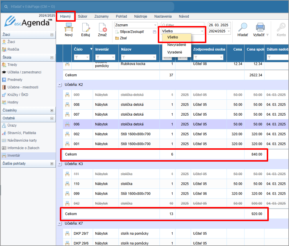 Z vášho zoznamu inventáru je možné zobrazovať Všetky položky, Nevyradené, alebo Vyradené položky so zodpovedajúcimi súčtami.