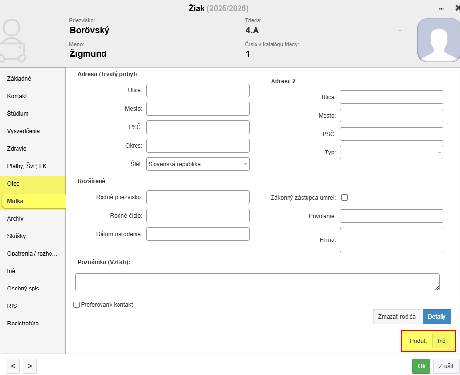 V karte žiaka, v záložke Otec alebo Matka, v spodnej časti kliknite na tlačidlo Iné: